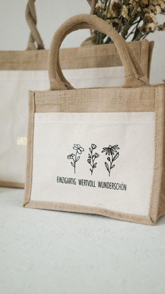 Jutetasche "EINZIGARTIG WERTVOLL WUNDERSCHÖN" Blumen, Geschenktasche, Shopper, Geschenke für Mama und die beste Freundin